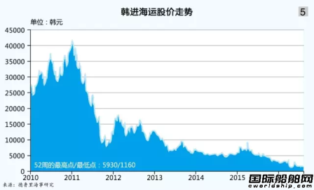 自原韩进海运社长赵秀镐2006年去世后,其遗孀崔恩英担任韩进海运社长,直至2014年。崔恩英因无力为韩进海运提供更多的金融支持,将控制权移交给大韩航空。近几年,韩进海运在遭遇全球运输业低迷后亏损严重、负债率高企不下(见图4),股价也是一路下跌(见图5)。
