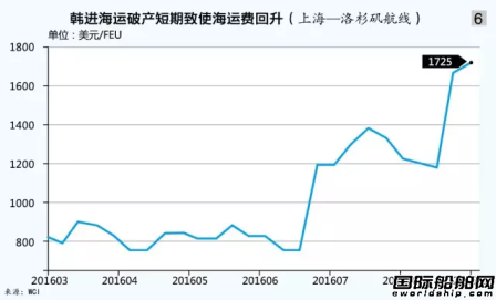 所以,托运人在选择合作承运人时,尽管成本低廉也是现实考量因素,但确实需要对承运人的财务和经营状况进行甄别。仅仅因为小部分的运费差价,而可能造成的巨大货物损失,甚至可能的违约风险都是托运人需要考虑的问题。而即使没有委托韩进海运承运货物的托运人,短期内也会因为市场运力减少所引起的运费上涨而受到冲击。如自9月1日起,从上海至洛杉矶和鹿特丹的运价分别上涨42%和39%(见图6)。