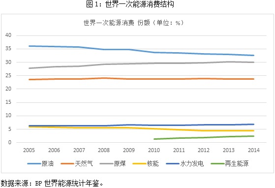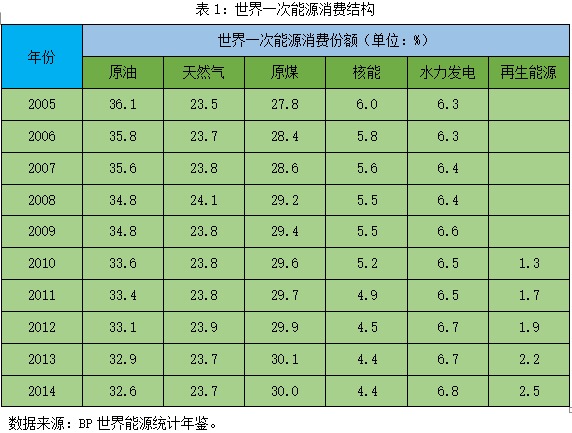 《巴黎气候协定》生效的前提是完成批准程序的缔约方占全球排放总量需超过55%。巴黎气候峰会召开后近一年,联合国于2016年10月5日才正式宣布,《巴黎气候协定》已经跨过生效门槛,将于今年11月4日正式生效,然而,俄罗斯、日本、澳大利亚等国却仍尚未批准。基于对传统化石能源的认知,几乎所有人都认可,无论从总量上看还是利用比例上看,作为能源的煤炭在21世纪将要“流年不利”,“可再生能源”的世纪将会来临。但是,从全球能源供应的角度,我们发现,化石能源所占的全球能源份额并没有明显下降,其内部结构却正经历着激烈而深刻的调整。未来有可能动摇原油能源霸主地位的,不是天然气,也不是再生能源,恰恰是老牌化石能源——煤。从英国石油公司(BP)出版的《世界能源统计年鉴》,我们可以很清楚地看到以上趋势(见表1、图1)。