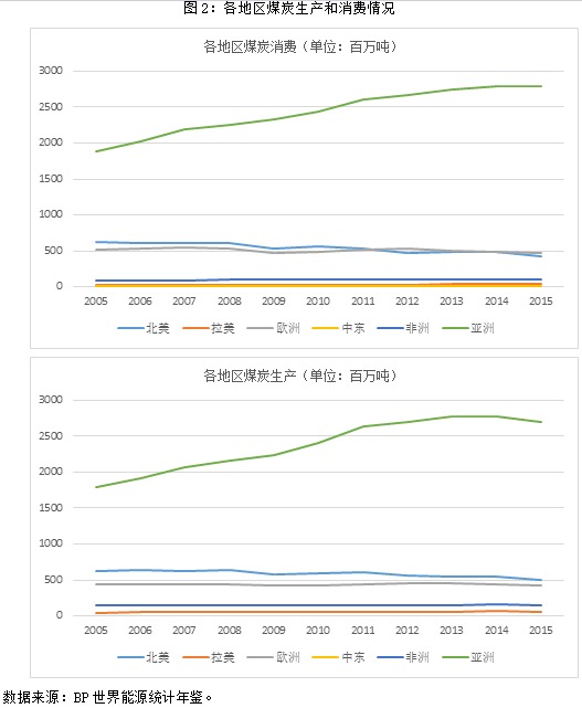 第一、越是发展中国家,煤炭增长越快,带动了全球煤炭占一次能源总体比例的增长。这是新兴经济体工业化的集中体现,亦是个体国家通过计算成本收益之后必然选择的工业化之路,历史上英、美、拉美等国家和地区也是如此。在后金融危机时代,经济发展速度依然强劲的国家基本集中在东南亚,新兴工业国家如印度、印尼,也已进入重工业化时期和能源瓶颈期,工业品的国内自产能力必须显著提升,才可以承接工业转移。2013年,东盟国家人均电力消费为1178度,大大低于世界平均水平(2824度),目前的电力消耗满足不了急速增长的工业用电需求。由图2可知,在世界煤炭使用和开采的版图中,亚太地区是占据绝对优势的。这些国家人口众多,其能源增量不容小觑。煤炭是最具性价比的能源,多数国家都储量丰富,符合国家能源独立安全目标,因而是这些国家能源供应的首选。