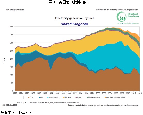 第二,发达国家在向再生能源转变过程中需要中继能源,火电负荷易调节、开关机成本较低,在一般技术条件下碳排放相较天然气高一倍,但在加入价格和可获得性因素之后,煤炭优势尽显。德国曾宣布,2040年前可再生能源达到能源供应的50%,并将核电排除在中继能源名单外,所以,近几年德国一次能中源煤炭消耗比例反而有所上升(图3);在气候变化方面较为激进的欧洲其他经合国家,虽然因各自能源政策选择了不同的能源路径,但是,现有化石能源发电比例均超过50%。例如,英国近年来发电构成情况,化石能源(煤、石油、天然气)发电比例依旧在50%以上(图4)。