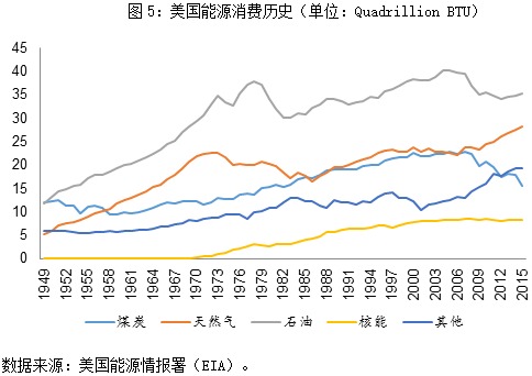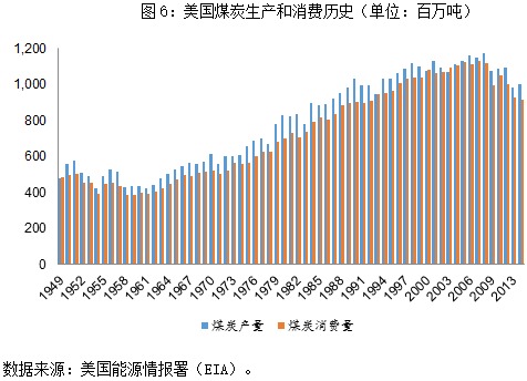 相应地,美国的煤炭行业自1950年就开始出现产能过剩,此后通过开拓海外市场,消化过剩的产量。到2005年,美国的煤炭产量及消费量达到顶峰,绝对量开始回落(图6)。