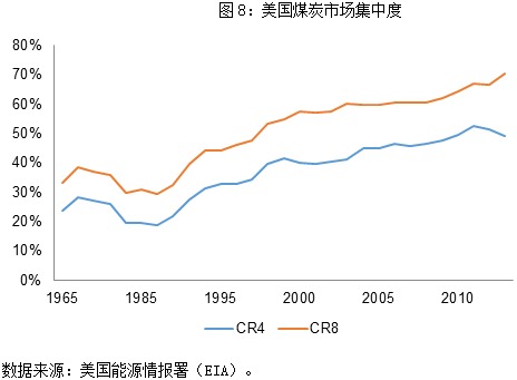但是,必须指出的是,美国煤炭行业走下坡路并非一朝一夕,而是已经持续了数十年。从近年的情况来看,美国煤炭销售均价并未出现大幅下滑,2005-2010年间甚至有所回升(图7)。而且,随着一系列并购重组的开展,美国煤炭行业的集中度不断提升(图8),龙头企业的盈利能力并未恶化。因此,能源结构的调整和行业景气度的下降难以构成皮博迪走向破产的根本原因。