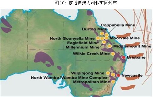 那么,皮博迪的破产的根本原因到底何在?这需要从公司自身经营商找原因。从公司的煤炭采掘业务分布来看,美国和澳大利亚是两个最主要的区域。美国方面,煤矿主要分布在Powder River Basin、中西部、西部等区域,煤种均为动力煤(图9)。澳大利亚方面,煤矿主要分布在新南威尔士及昆士兰,煤种涵盖了动力煤、炼焦煤及喷吹煤三类(图10)。从产量分布来看,美国本土产量占比在80%(表2)。