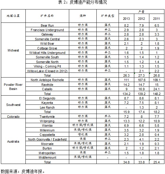 皮博迪能源公司自1883年成立后,经历了辉煌的发展历程:20世纪20年代成为伊利诺伊最大的煤炭生产商;1955年与 Sinclair 煤炭公司合并,总部迁至密西西比河中游的圣路易斯;一连串的并购以及两次在纽交所上市……2011年,它跨过大洋以51亿美元杠杆收购了澳大利亚Macarthur煤炭公司,瞄准来自亚洲钢铁冶金行业的需求。截至2014年,皮博迪仍然是美国最大的煤炭生产商,年煤炭产量达到1.9亿吨,占美国全国产量的近20%。