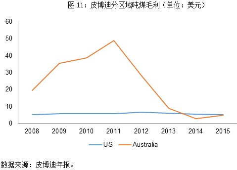 如前所述,美国的煤炭行业集中度不断提升,基本形成了寡头垄断的格局,从而维护了煤价的基本稳定以及龙头公司的利润。但是,从2012年开始,公司整体净利润出现亏损,究其原因,美国区域的煤炭业务整体仍然盈利,亏损主要来自澳洲区域。我们对企业所在两个区域的吨煤指标进行测算,从2007至2015年的数据来看,比较明显的趋势是美国区域的煤矿经营情况十分稳定,无论从价格、成本还是毛利,基本维持平稳态势。与美国形成鲜明对照的澳大利亚矿区,2011年以来成本投入增幅较大,主要原因在于劳工工资水平不断上涨、降低污染和提高政府财政收入的税收方案的实施。虽然澳洲矿的价格整体高于美国本土,但由于成本的快速提升导致吨煤毛利下滑幅度惊人。加之并购带来的刚性的财务费用、折旧摊销,澳洲业务整体呈现亏损状态(图11)。