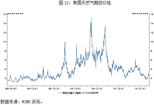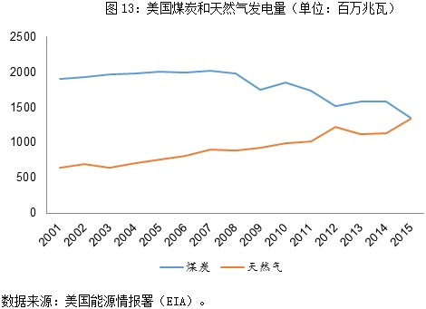 近年来,随着页岩气革命的爆发,不断增加的供应使得天然气价格大幅下滑,目前的天然气价格相对于2008年的高点低了近80%(图12)。天然气发电综合成本的绝对优势促使更多的电力公司转而使用天然气,截至2015年,美国天然气发电量已经赶上煤炭发电量(图13)。