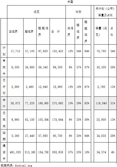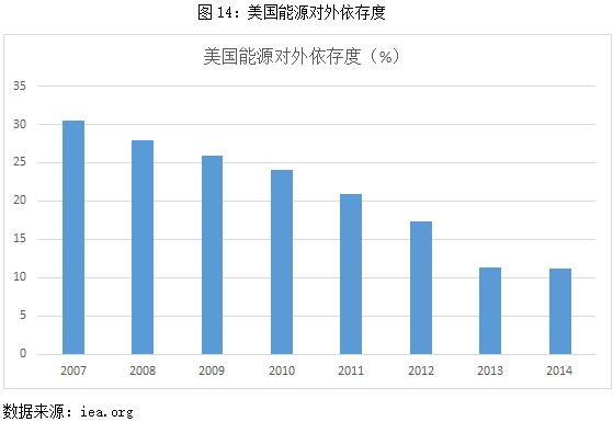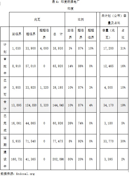 美国本土能源结构中化石能源内部大幅调整的核心还是源于其国家利益,通过“页岩气革命”在过去的十年,其能源依存度已经从30%降低到11.1%(图14),使美国在面对波诡云谲的国际政治经济格局时更显游刃有余,对中国煤炭企业而言,既不应将美国煤炭企业所面临的行业困境简单归咎于世界能源领域的“去煤化”,又不能因为油气煤等大宗商品价格周期低徊而妄自菲薄。中国有中国的能源诉求,习近平总书记在中共中央政治局研究“十三五能源规划”的会议上强调“要立足国内多元供应保安全,大力推进煤炭清洁高效利用”,中国确实是煤电的超级大国,但相对而言也是全球清洁煤电(特别是高效低排放的超超临界煤电)的领跑者。在中国858.94吉瓦煤电装机中,超临界、超超临界机组装机占43%,而中国以外的其他国家煤电装机中超临界、超超临界机组比例为26%(表3)。印度煤电装机为202.10吉瓦,但是没有超超临界机组,超临界机组仅占全部煤电装机的20%(表4)。