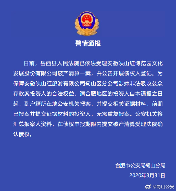 据合肥市公安局蜀山分局官方微博消息,日前,岳西县人民法院已依法受理安徽映山红博览园文化发展股份有限公司破产清算一案,并公告开展债权人登记。为保障安徽映山红旅游有限公司蜀山区分公司涉嫌非法吸收公众存款案投资人的合法权益,请合肥地区的投资人自本通报之日起,到户籍所在地公安机关报案,并提交相关证据材料。前期已报案并提交证据材料的投资人,无需重复报案。公安机关将汇总报案人资料,在债权申报期限内提交破产清算受理法院确认债权。