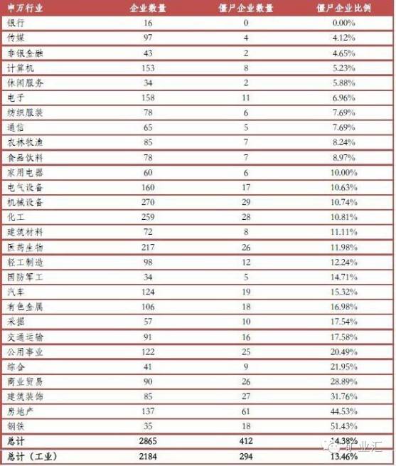 报告称,僵尸企业比例最高的五个行业分别是:钢铁(51.43%)、房地产(44.53%)、建筑装饰(31.76%)、商业贸易(28.89%)和综合类(21.95%)。