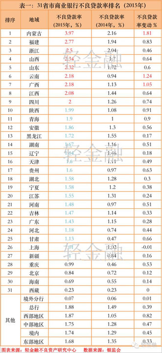 值得注意的是,中国商业银行的不良贷款数据仍然在持续双升。轻金融不良资产研究中心根据最新公布的《2015年银监会年报》统计发现,2015年31个省市自治区(下称“省市”)中,有29个不良贷款率上升,整体增加了0.45个百分点;内蒙古、福建、浙江等9个省市的不良贷款率在2%以上;甘肃、云南、重庆等7个省市的不良贷款规模增幅超过了100%,显示西部地区不良风险暴露更快;浙江、山东和广东等7个省市的不良贷款规模增加了200亿元以上,东部地区依然是不良贷款风险的集中地。