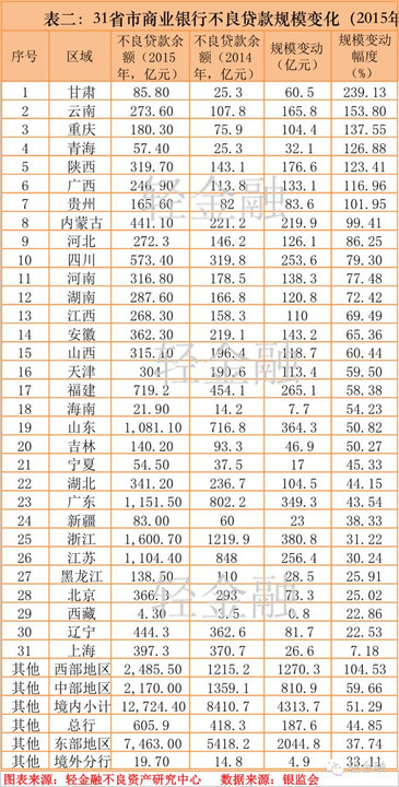 1.2015年,共有甘肃、云南、重庆、青海、陕西、广西、贵州等7个省市的不良贷款规模相比前一年翻番,其中甘肃增幅最高,达到239%;