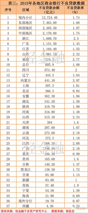 2.2015年末有12个省市的不良贷款率超过了商业银行整体不良率1.74%;