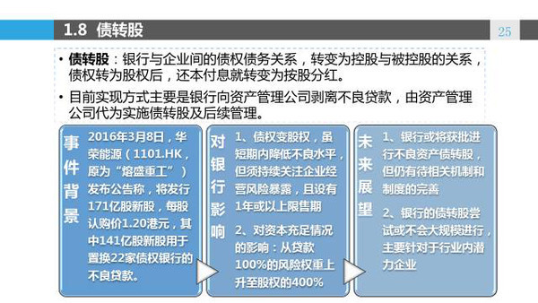 对于债转股,业界争议颇多。基本共识在于短期内能化解银行资产质量压力,也能缓解企业偿债负担。但是长期来看,并不能解决企业经营不善,银行与企业过度捆绑的问题。