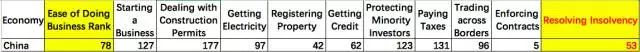 中国的排名如上图所示,整体营商便利度位于第78,“破产处理”单项位于第53位。