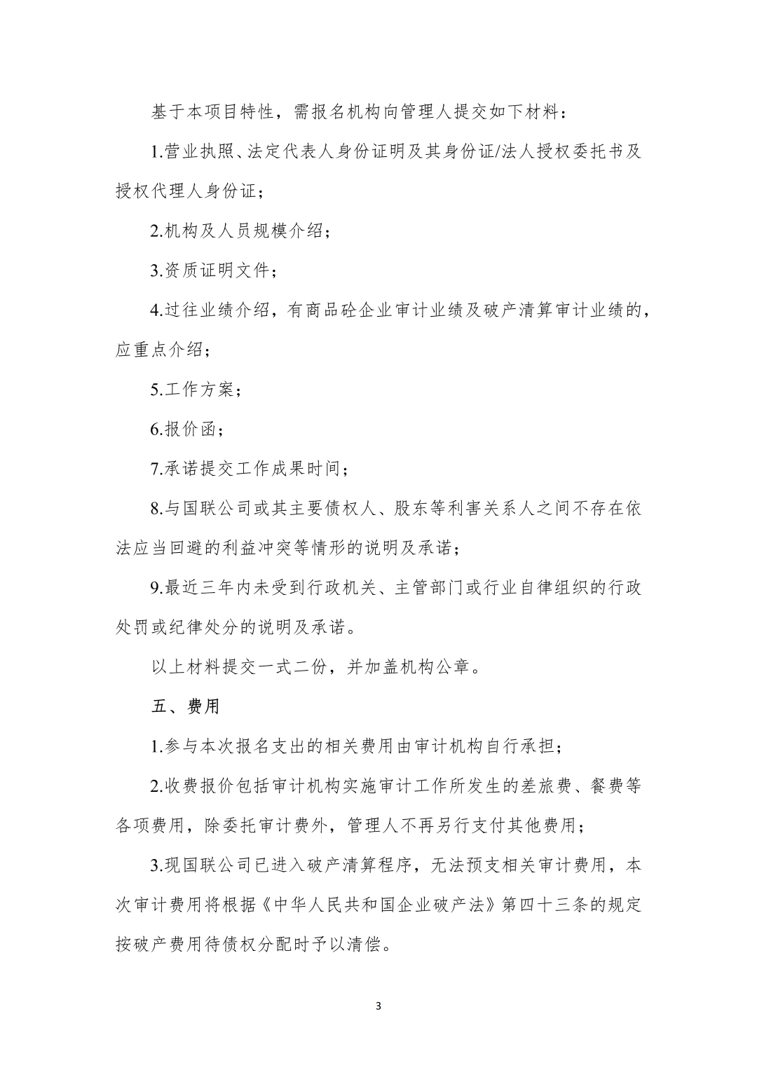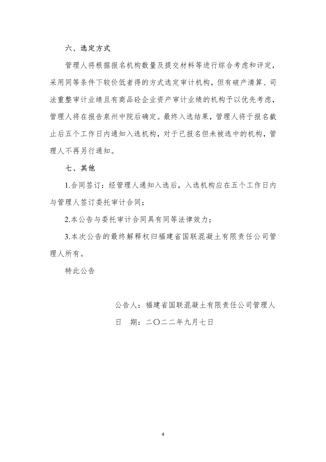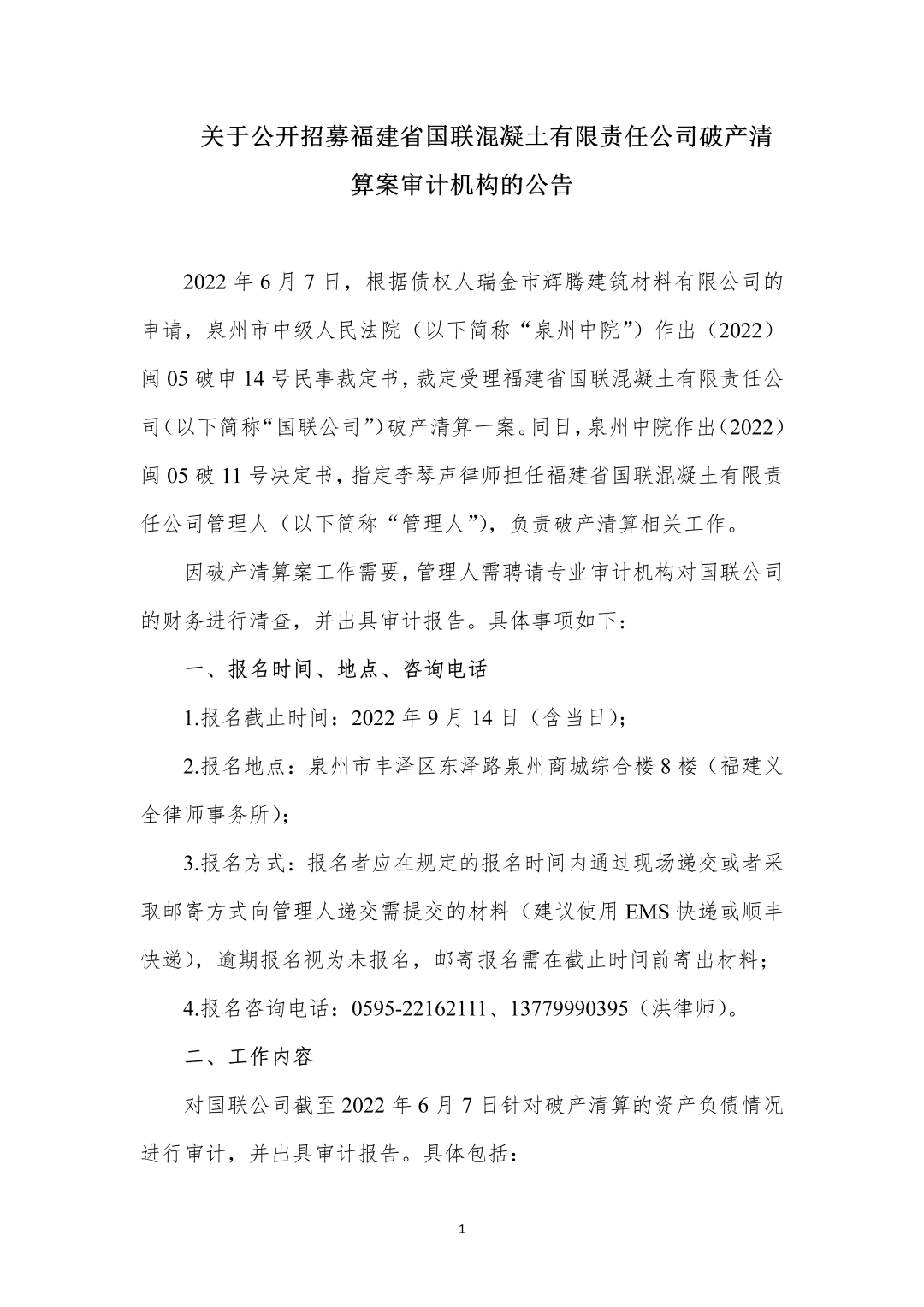 关于公开招募福建省国联混凝土有限责任公司破产清算案审计机构的公告