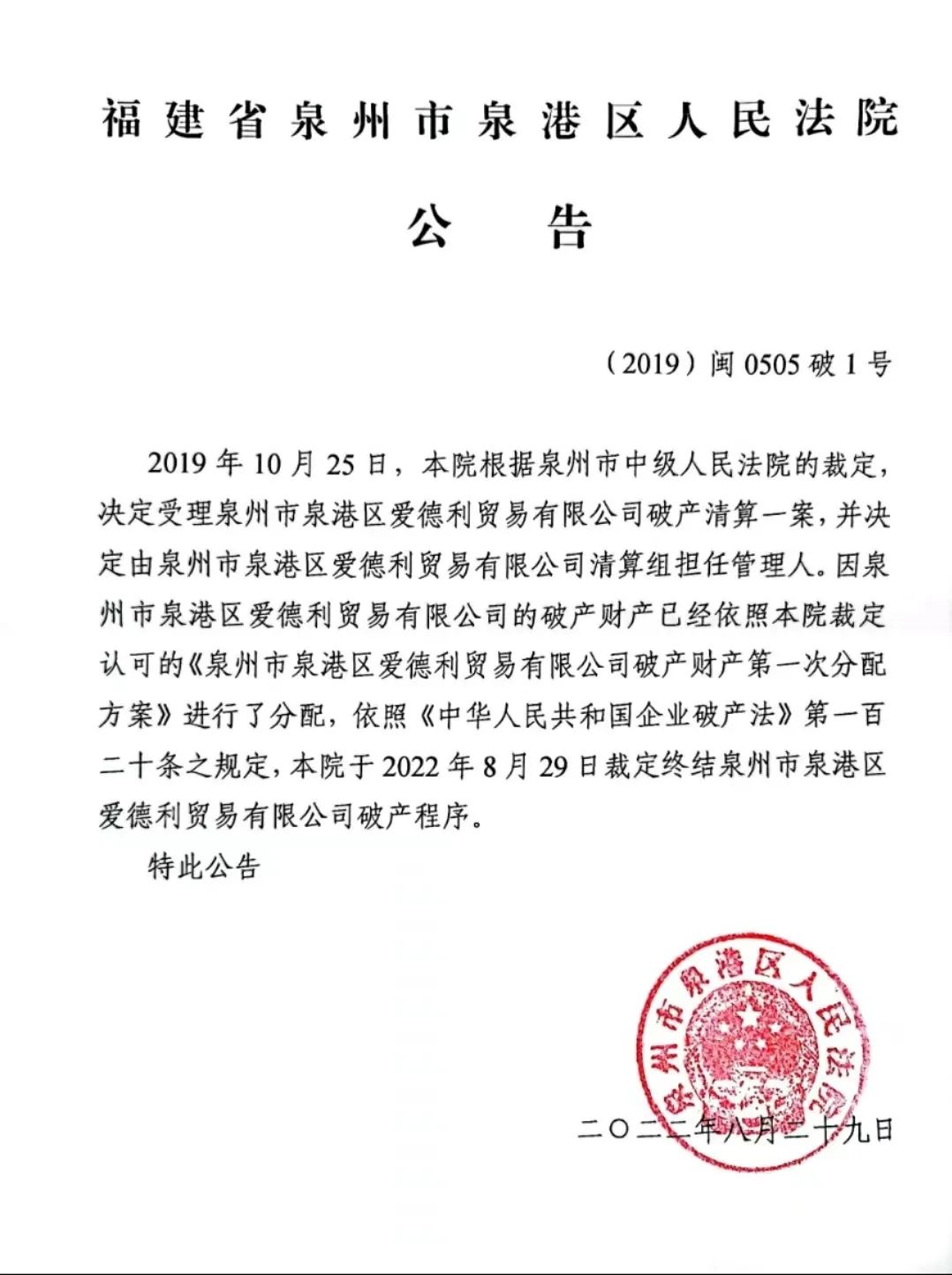 裁定终结泉州市泉港区爱德利贸易有限公司破产程序的公告