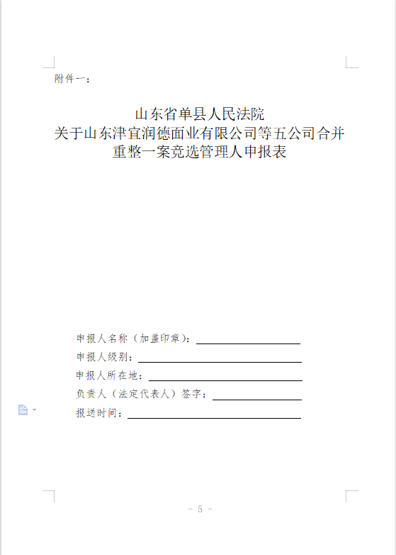 山东省单县人民法院关于山东津宜润德面业有限公司等五公司合并破产重整一案竞争方式选任管理人的公告
