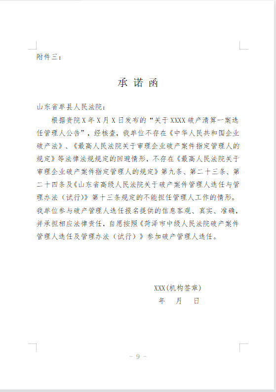 7.就相关事项作出的承诺:申报材料的真实性承诺;不存在应当回避或依法不应被指定为管理人情形的承诺;履职中将勤勉尽责、忠实执行职务、遵守相关法律规定、依法接受人民法院和债权人会议监督的承诺。