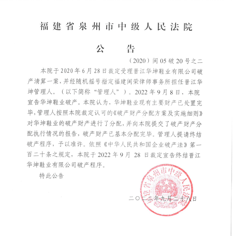 裁定宣告晋江华坤鞋业有限公司破产并终结破产程序