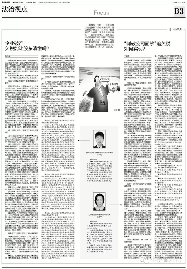 按:本文发表在《中国税务报》2016年11月29日B3版。本版另一位“法治圆桌”对谈嘉宾为辽宁省地税局政策法规处处长王翠华,题目为《“刺破公司面纱”追欠税,如何实现?》。