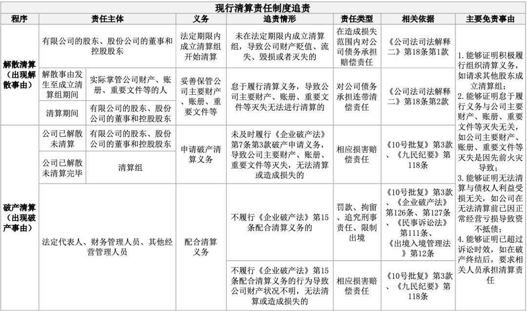 为便于检索,笔者对现行清算责任制度下追责情形,归纳如下: