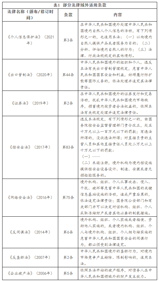 相对于刑法关于域外适用的系统性规定,经济法、行政法等非刑事法律部门对域外适用的规定则比较零散,尚未形成完备的体系。有的法律设有专门条款,对该法的域外适用情况作了明确规定,如《反垄断法》《破产法》《个人信息保护法》;有的法律就局部特定情况设定了域外适用的条件与具体后果,如《核安全法》《网络安全法》(见表1)。