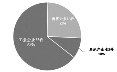 尚在审理的51件破产案件中,涉及工业企业33件、商贸企业13件、房地产企业5件(见图二)。还有部分破产企业为关联企业,且涉及不同的行业。