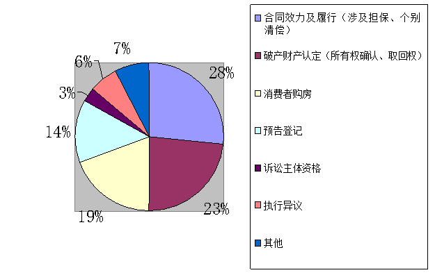 从基本案情与争议焦点来看,样本案件集中于合同效力认定及履行、破产财产认定、消费者购房、诉讼主体资格、预告登记、执行异议等内容,具体比例如下表所示(表一为最高院73个案例,表二为其他法院200个案例)。