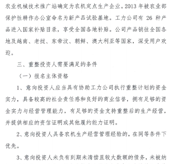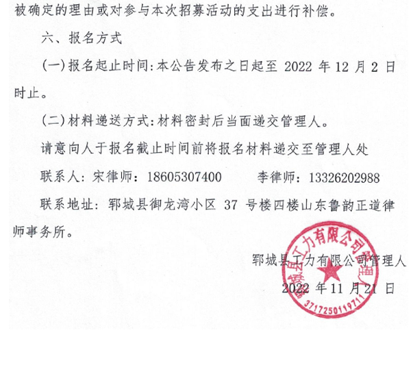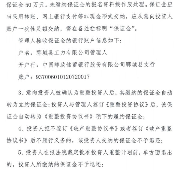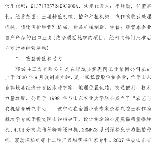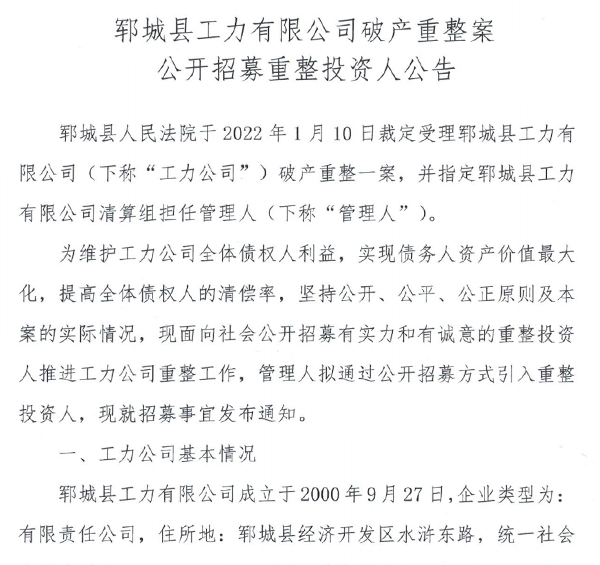 郓城县工力有限公司破产重整案公开招募重整投资人公告