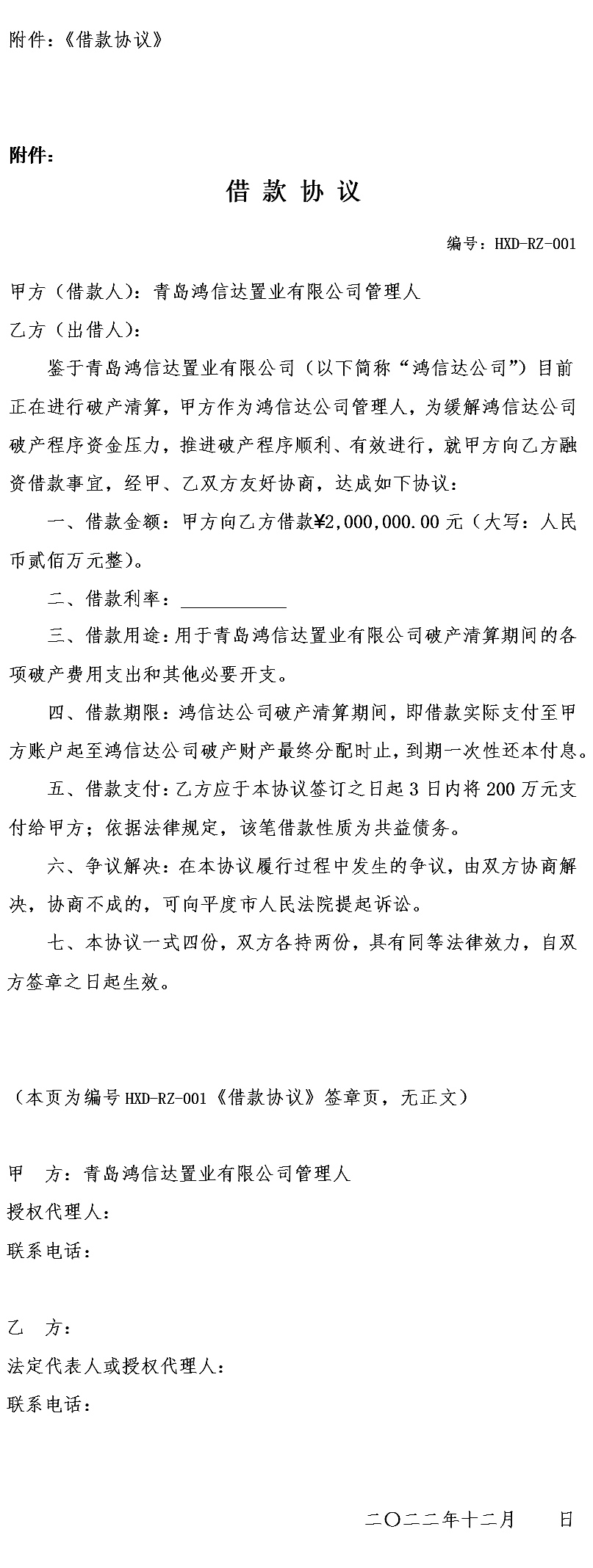 1.管理人将根据各意向出借人提交的意向材料择优确定最终的意向出借人。在最终的意向出借人确定后,管理人将按附件格式与出借人签订借款协议。