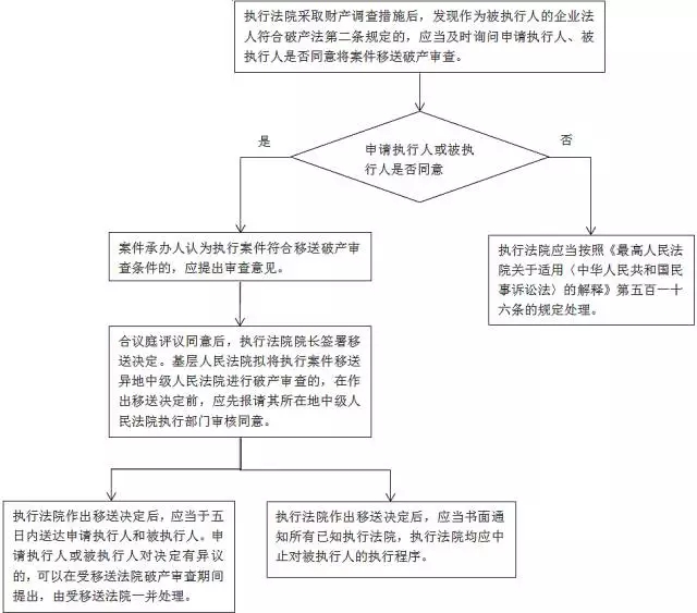执行转破产程序是法院系统的内部工作程序,这实际上可以区分为两种类型,一是单个法院内部之间的转换程序,这涉及的工作程序将较为简单,但考虑到前文涉及的管辖方面的规定,更多的案件将在不同法院之间转换程序,其中涉及的工作流程较为复杂。从执行法院的角度来看,具体流程如下:
