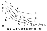 国有企业重组可以产生两种效应一种是替代效应。能够改变配置到与的成本比例。反映在预算线上则是斜率变大, 变为, 与相切与, 与点相比,效用得到增加另一种是扩展效应。预算线向外扩展, 由变为了, 在坐标轴上的截距增加, 与, 相切与点,经济效用得到了进一步的提高。此时点与点相比, 配置到产业的经济资源获得了增加, 而配置到的有所减少,给社会带来更多的社会福利, 多出来的部分就是企业重组所产生的收益。从动态的角度看, 随着改革的不断深化,国有企业重组的广度、深度不断加大, 预算线会逐步向外扩展, 斜率会不断增加,经济状况会由向更优点移动,社会福利获得了进一步的增加。