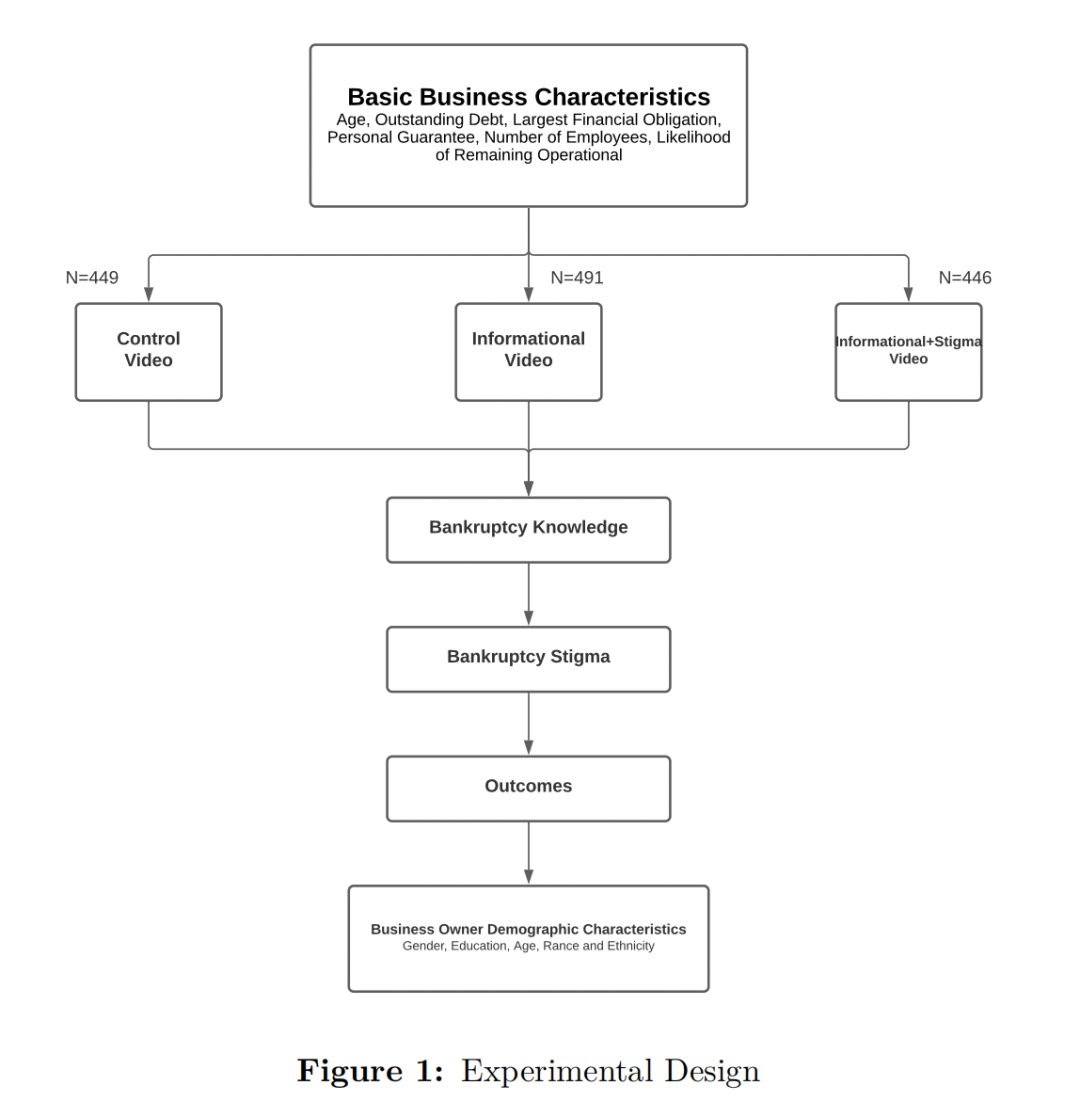 学者们试图探究中小企业间信息不对称和污名化破产的现象。在此基础上设计了一项实验,对比在观看不同内容的破产知识科普视频后中小企业破产意愿和经营行为上的变化。最终得出结论:实验中大部分中小企业对破产制度并不了解,并表现出对于破产的反感与偏见。视频中传达的破产法功能及具体影响等信息对企业的预期行为产生了影响,具有积极作用。