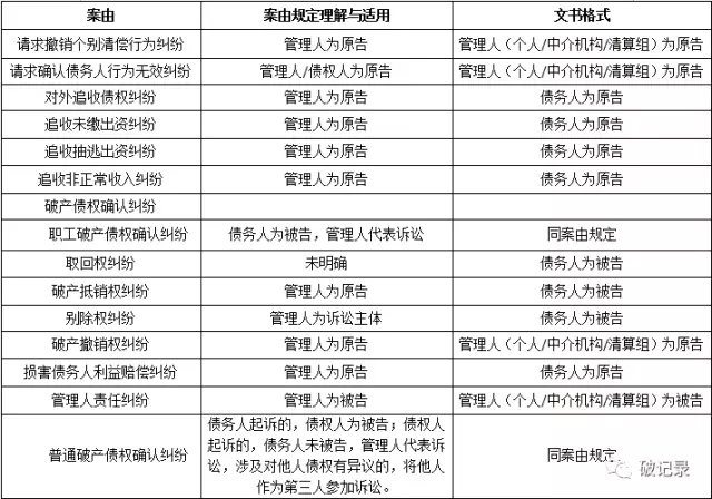3. 管理人作为诉讼主体时,文书格式中的文本示范将法院指定为管理人的个人/中介机构/清算等列示为诉讼主体,而案由规定的理解与使用未予以明确。