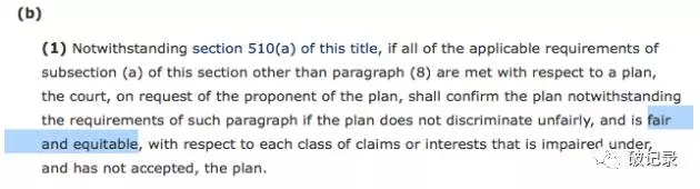 译者的看法并非夸大之辞。实际上,破产法律人口中念念不绝的“绝对优先”(absolute priority),在美国“破产法典”条文中并不见踪影。追根溯源,这一规则的确立确是拜美国法院判例所赐,同时也围绕着“法院是否应当批准一项(债权人拒绝接受)的重整计划”这一问题以及相关争讼不断发展。在美国“破产法典”中,在意涵上与“绝对优先”对接的条款是第1129(b)(1)款,对接的核心概念是“公平与公允”(fair and equitable)。实际上,“绝对优先”描述的仅仅是这一规则的外观,而重整计划的“公平与公允”才是这一规则的内涵与目标所在。