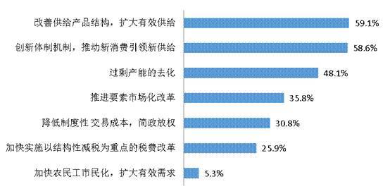 伴随中国经济进入新常态,供给与需求的结构性矛盾凸显,供给侧改革已成为中国经济改革的主线。在供给侧改革最需推进的领域调查中,排名前五名的分别为“改善供给产品结构,扩大有效供给”(59.1%),“创新体制机制,推动新消费引领新供给”(58.6%),“过剩产能的去化”(48.1%),“推进要素市场化改革”(35.8%),“降低制度性交易成本,简政放权”(30.8%)。逾半数银行家认为改善供给产品结构、创新体制机制是供给侧改革中最亟需推进的领域,这两项分别从产品端和机制方面激发活力,扩大有效供给,提高供给结构对需求结构的适应性,较为直接地刺激供给端,契合供给侧改革的内涵。过剩产能去化、降低制度性交易成本、推进要素市场化改革也是针对当前中国经济的结构问题所提出的亟需改进的领域,分别通过优化产业结构、改善实体经济环境、激发市场活力等方面使供给和需求更加匹配,调节、优化经济结构,与 “三去一补一降”重要任务的内涵相吻合。