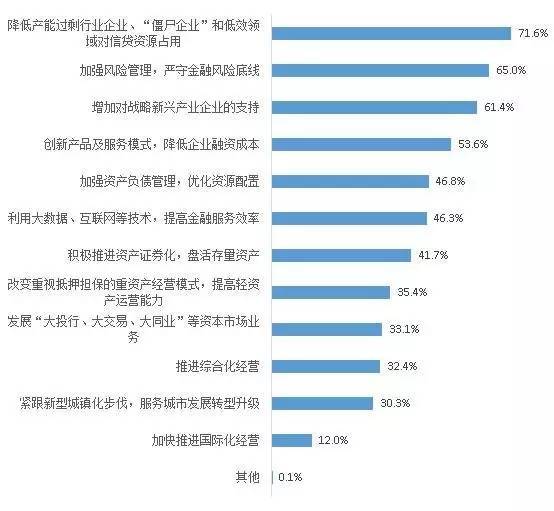 关于银行配合供给侧结构性改革所侧重的工作中,超过七成的银行家认为“降低产能过剩行业企业、‘僵尸企业’和低效领域对信贷资源占用”(71.6%)是银行的首要工作。其次,“加强风险管理,严守金融风险底线”(65.0%)和“增加对战略新兴产业企业的支持”(61.4%)也广受关注。数据反映出银行家们在供给侧改革方面的工作思路:从行业角度看区别对待,对过剩行业加强风险管理,对战略新兴产业给予信贷支持。从周期角度来看分轻重缓急,眼下优先完成“治标”工作——去产能、去库存、去杠杆,长远处理“治本”任务——创新产品、优化能力、提升效率,最终达到降成本、补短板。