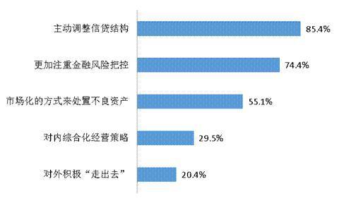 “三去”大环境下,85.4%的银行家认为应该主动调整信贷结构,74.4%的银行家认为应该更加注重金融风险把控,55.1%的银行家选择应该用市场化的方式来处置不良资产。事实上,我国商业银行不良贷款与过剩产能行业密切相关,银行急需转向优质产业来调整信贷结构。随着供给侧结构性改革的推进,实体经济融资需求呈现逐步向小微企业和新经济业态转移,这为银行紧跟发展趋势主动调整信贷结构提供了契机。银行应把握宏观政策导向和经济发展趋势,大力支持绿色经济发展、推动战略性新兴产业成长,主动改善信贷结构、降低信贷风险。