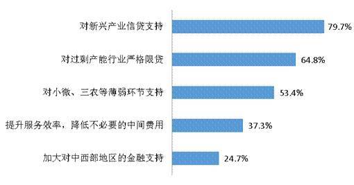 银行业是我国金融体系中的重要一环,也是支持“三去”的金融生力军。银行家认为可以从以下几方面支持“三去”:“新兴产业信贷支持”(79.7%)、“对过剩产能行业严格限贷”(64.8%)、“对小微、三农等薄弱环节支持”(53.4%)、“提升服务效率,降低不必要的中间费用”(37.3%)、“加大对中西部地区的金融支持”(24.7%)。落后产能的严重过剩,使市场供求失调、资金利用率降低、优质企业的发展受抑制,极大地降低了行业整体竞争力,也减慢了经济增长步伐。因此,银行应将信贷资源从产能过剩及落后产业有序转移到新兴及政府扶持的产业,向具备经济增长动力的产业倾斜,改善银行信贷结构以支持我国产业的升级转型。此外,对于小微、三农等薄弱环节,银行可以通过专项政策进行重点支持,弥补实体经济发展短板,并通过规范中间业务,减少收费项目、降低费率,降低企业融资成本。
