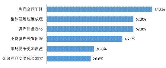 “三去一降一补”是供给侧改革的重要任务,是2016年的经济工作重点。银行家认为“三去一降一补”对银行业的冲击包括“利润空间下降”(64.3%)、“整体发展速度放缓”(52.8%)、“资产质量恶化”(52.8%)、 “不良资产处置困难”(46.1%)等。在当前经济增速放缓、产业结构失衡、不良资产攀升的背景下,银行的盈利能力大大受限。加之利率市场化带来的挑战,银行体系资金成本上升,存贷利差收窄,盈利能力下降,因此利润空间下降基本成为银行家的共识。