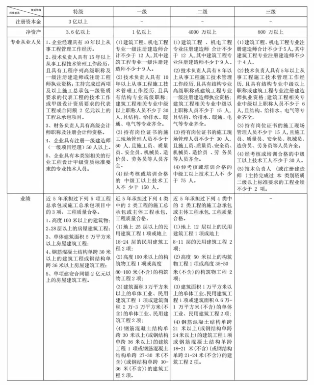 但凡施工型建筑企业,均具有较高的社会价值。下表根据中华人民共和国住房和城乡建设部发布的《关于印发〈施工总承包企业特级资质标准〉的通知》(建市[2007]72号)与《建筑企业资质标准》(建市[2014]159号)罗列了各级别施工总承包资质的具体核准要求。