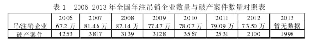 自1986 年《企业破产法(试行)》实施以来,我国破产法长期未能解决的问题之一就是破产案件的数量过少,许多本应通过破产实现市场退出或挽救的企业却并未进入破产程序。自2006 年《企业破产法》实施以来,人民法院受理的破产案件数量总体上呈下降趋势。据统计,2006 年至2012 年中全国每年吊/ 注销企业的数量以及破产案件的审结数量如表1 所示。
