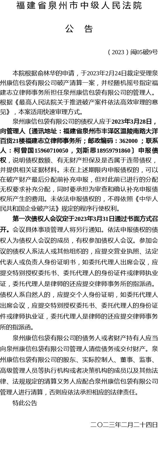 泉州康信包袋有限公司破产清算一案裁定受理公告