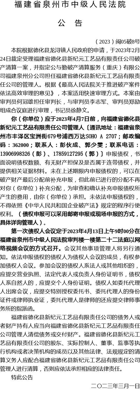 福建省德化县新纪元工艺品有限责任公司破产清算一案裁定受理公告