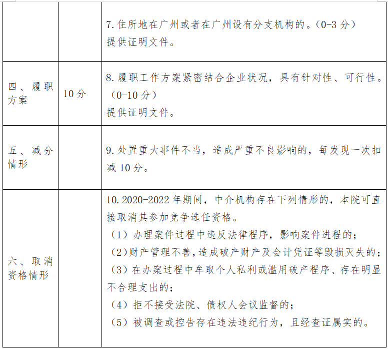 (二)回避要求。中介机构具备法定回避情形未主动申请回避仍然报名参与竞争的,经查证属实后取消其在本辖区一年内参加管理人指定的资格,并报广东省高级人民法院备案。