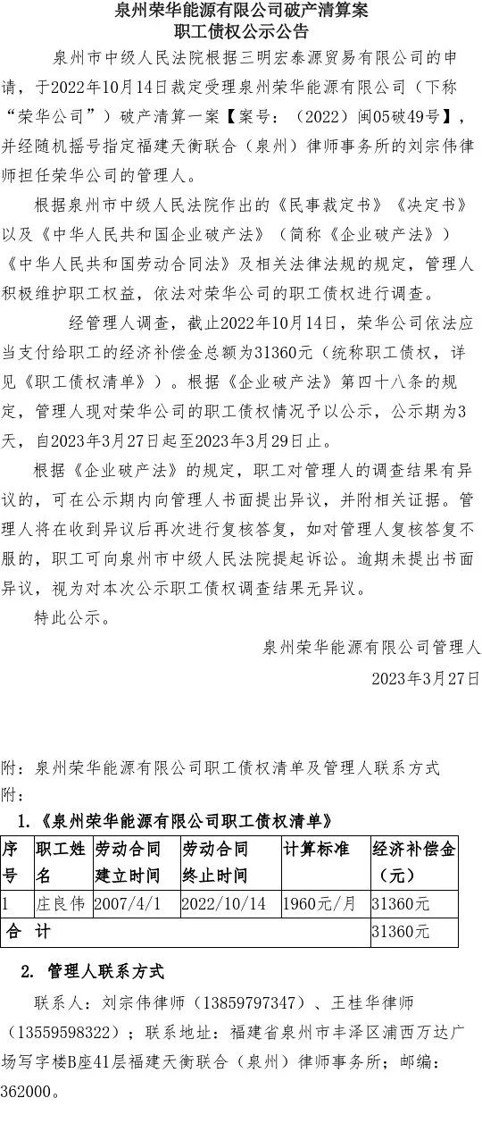 泉州荣华能源有限公司破产清算案职工债权公示公告