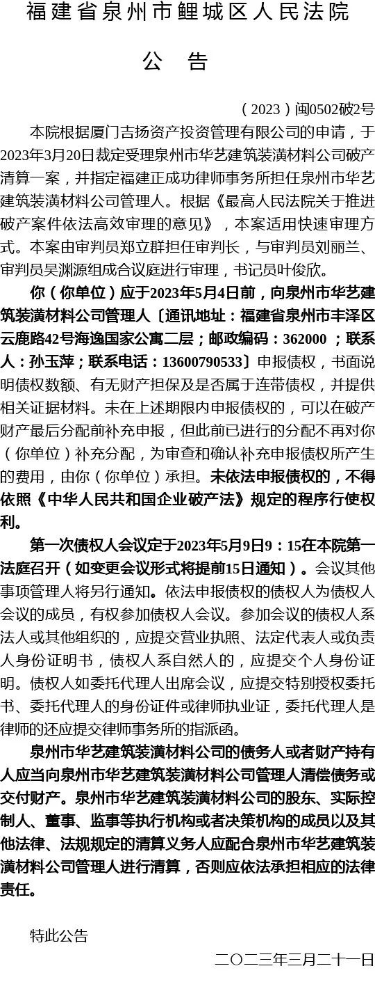 泉州市华艺建筑装潢材料公司破产清算一案裁定受理公告