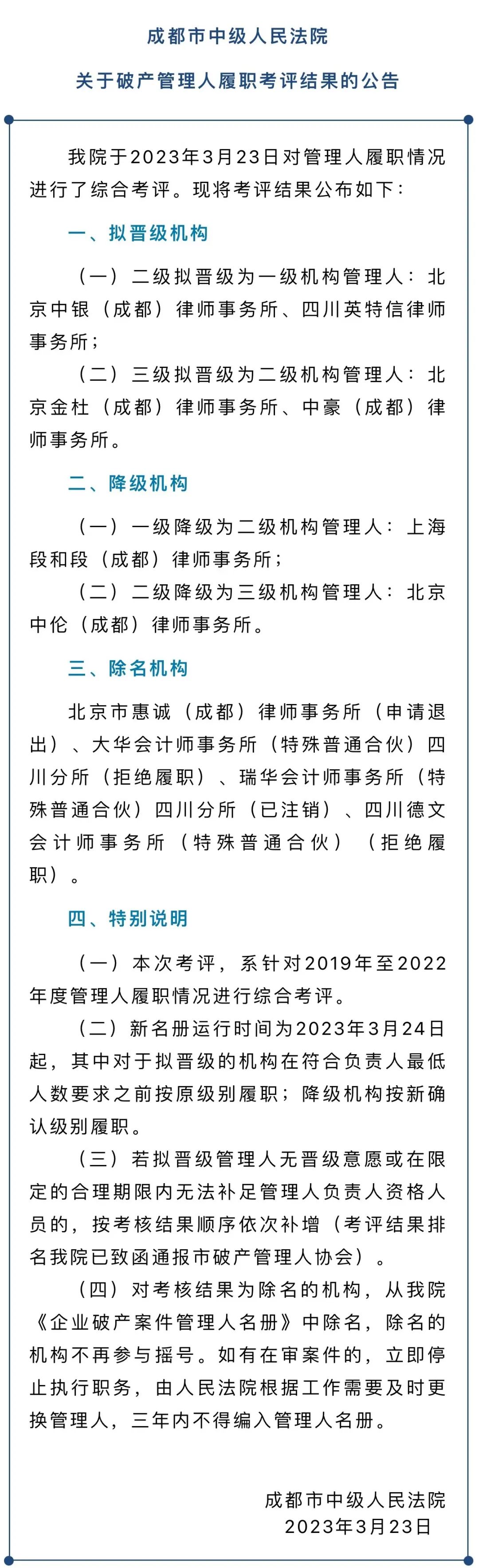 2023323北京中银(成都)律师事务所、四川英特信律师事务所;拟由三级管理人晋级为二级管理人据悉,成都中院管理人名册中的所有机构均纳入本次评价和调整,主要考察管理人2019年至2022年的履职情况,包括个案考评和历年年度考评情况,系其中重要的评价指标,体现了成都中院对管理人机构在理论研究、综合素质方面的重视和要求。