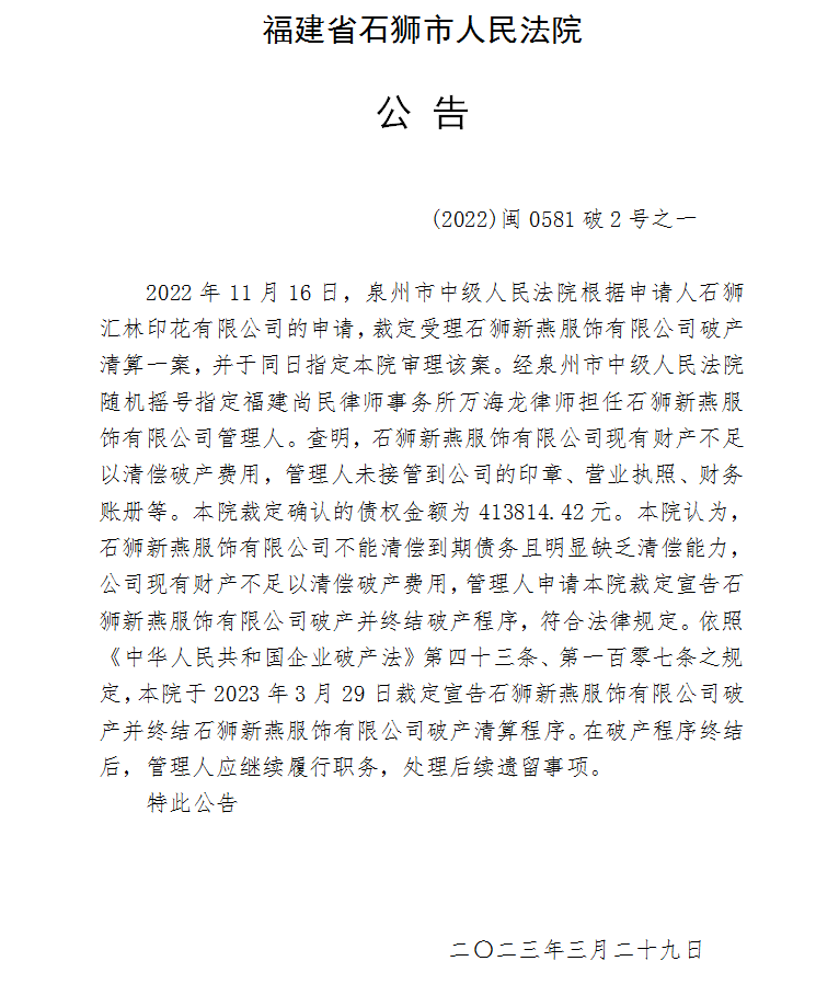裁定宣告石狮新燕服饰有限公司破产并终结破产清算程序